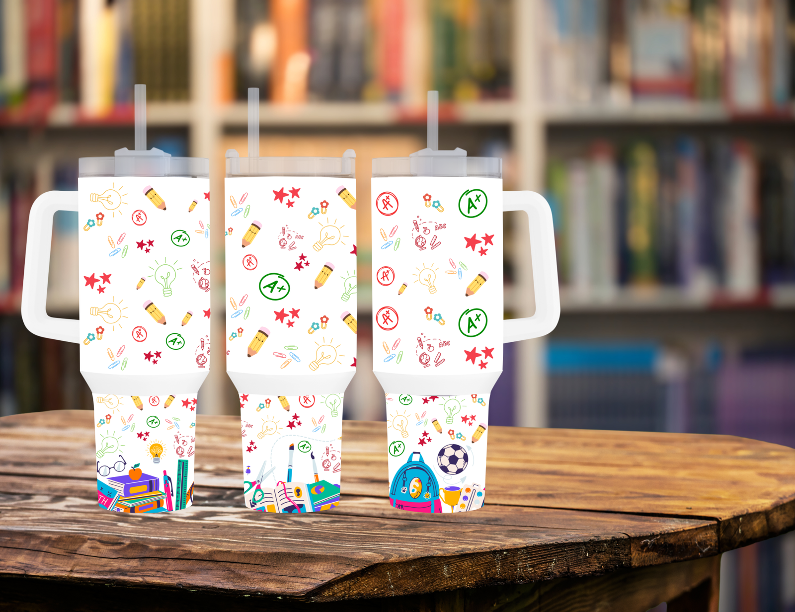 Are you tired of constantly refilling your cup? Meet our school-themed 40oz travel mug with handle! Designed with both students and teachers in mind, this mug promises to keep you refreshed throughout the day.