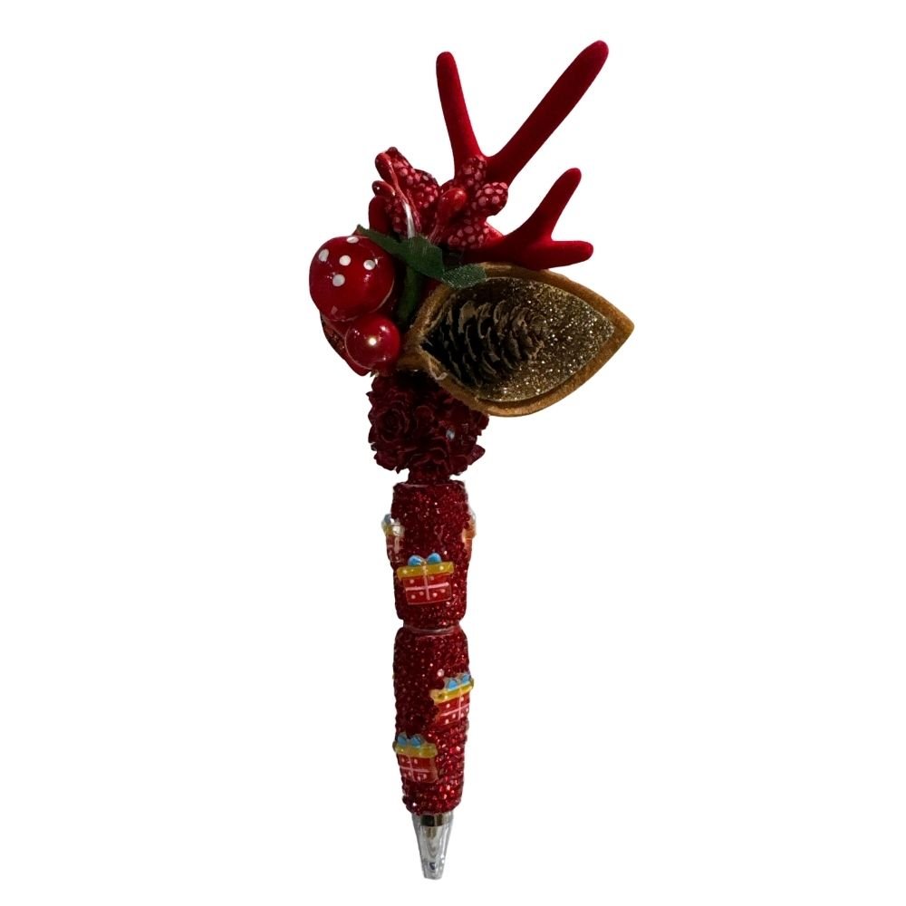 Turn every note, list, and journal entry into a festive moment with this Handmade Christmas Rhinestone Beaded Pen, designed to add instant holiday magic to your workspace. Crafted with shimmering red rhinestones, festive gift-box beads, and a handcrafted topper complete with faux berries, pinecones, and reindeer antlers — this pen is more than a writing tool.