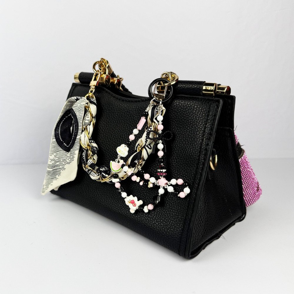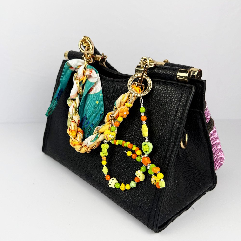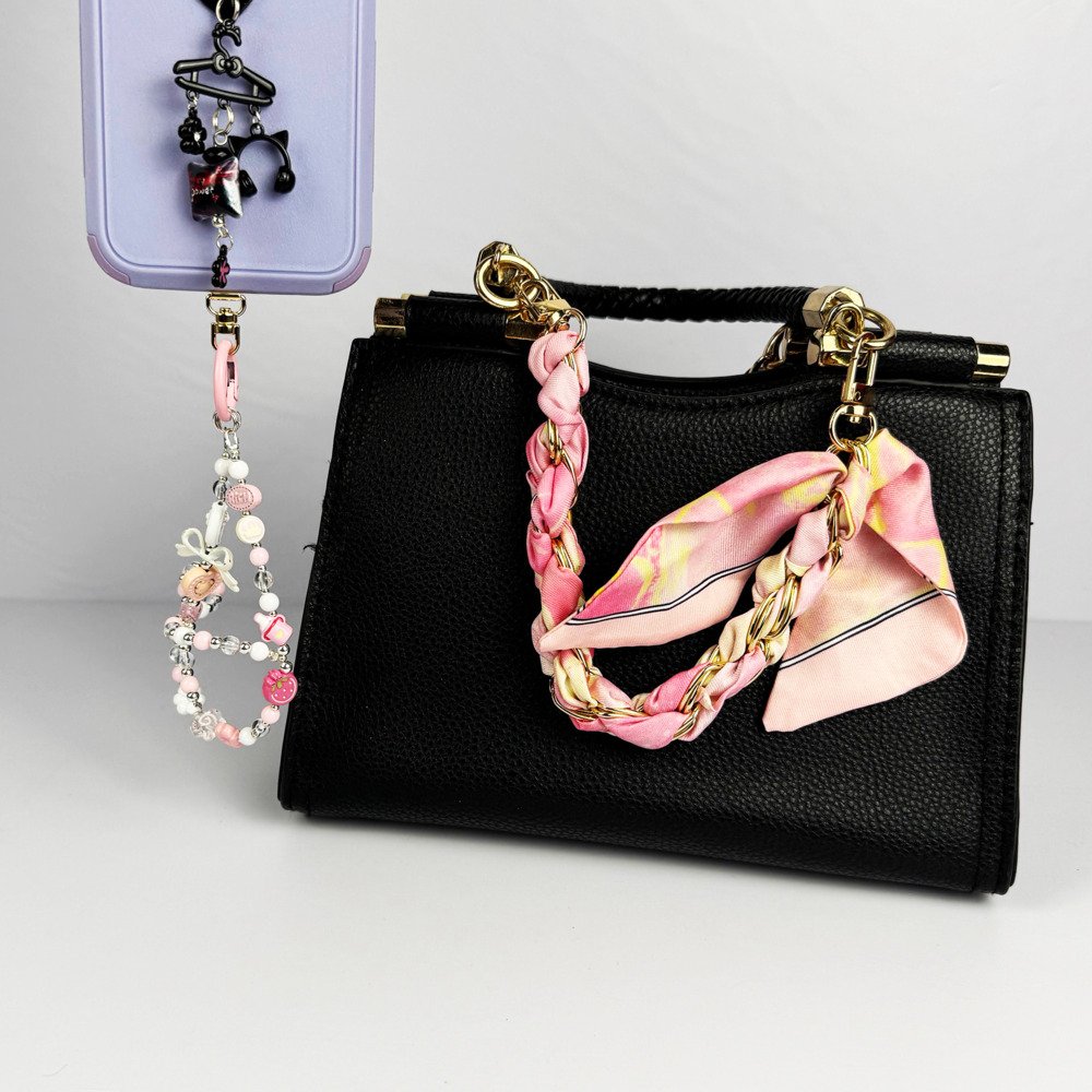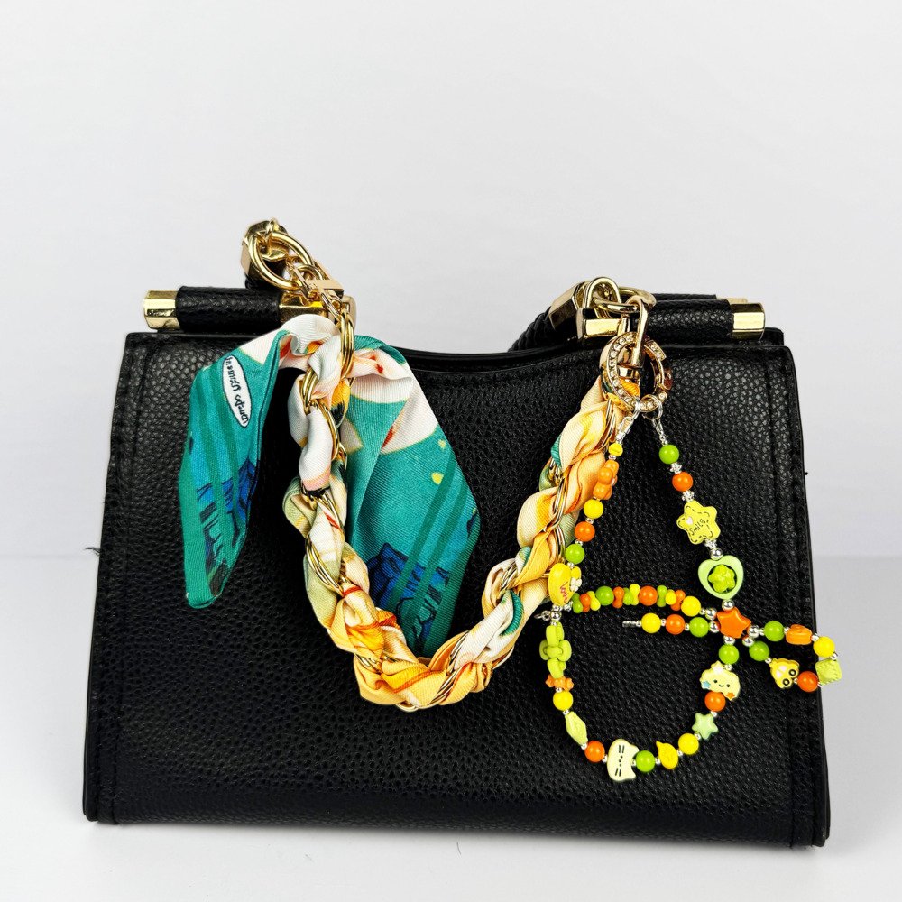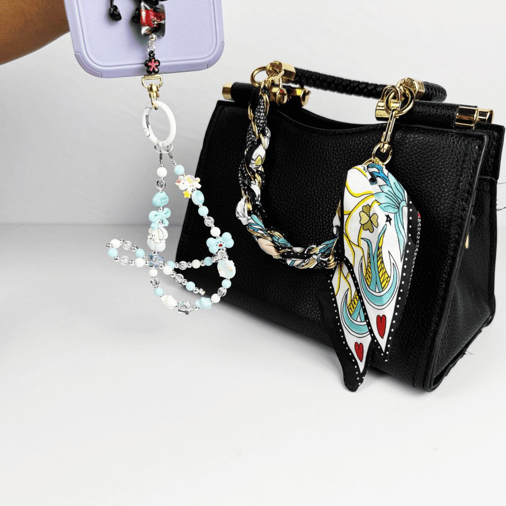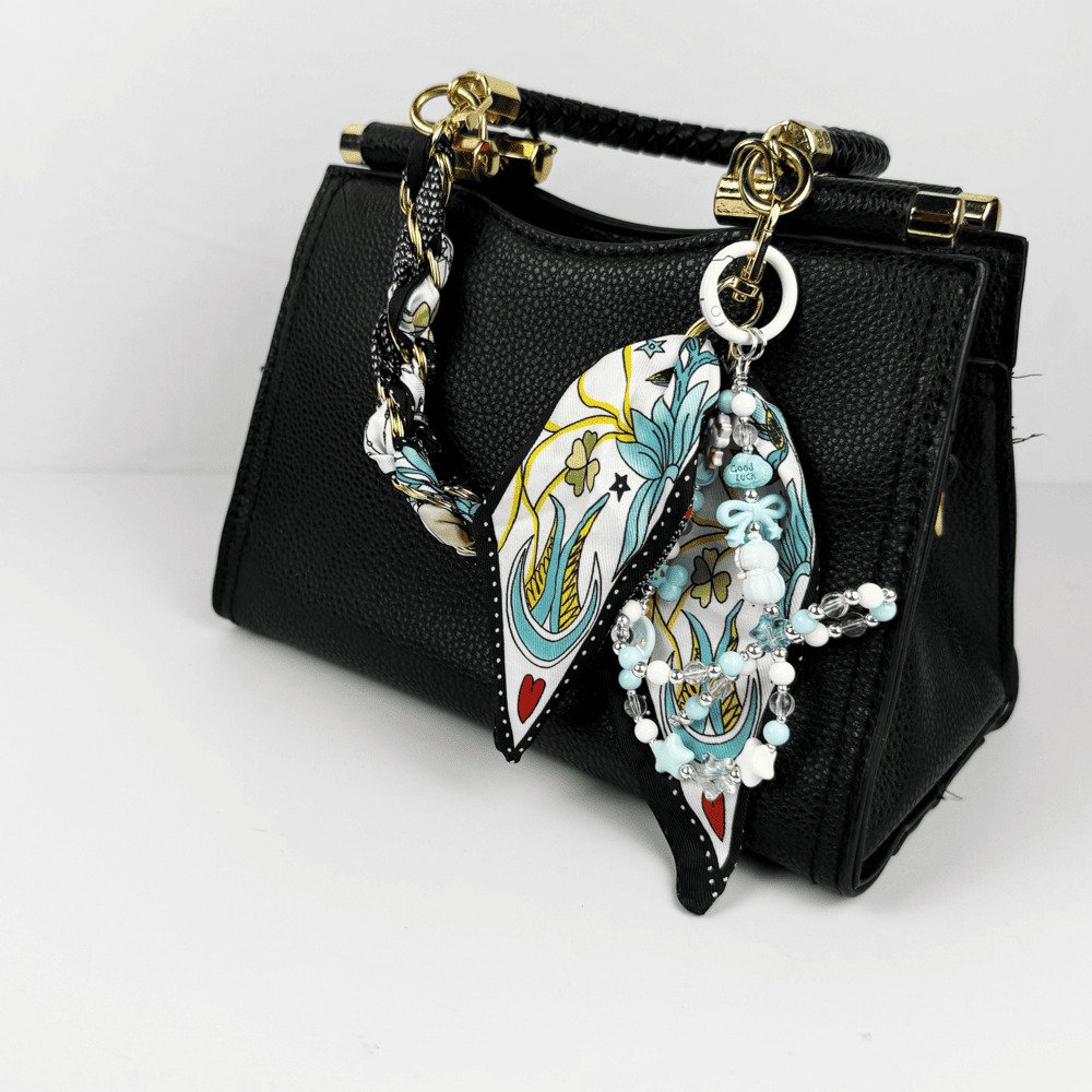 Featuring a fabric scarf chain, a pastel beaded strap, and a gold metal clip, this versatile accessory instantly transforms ordinary bags into stylish statement pieces.