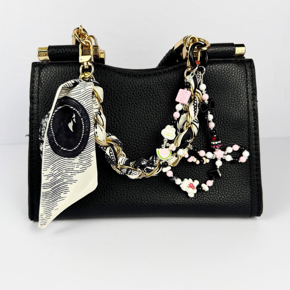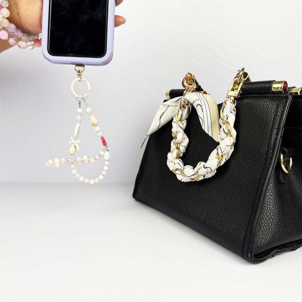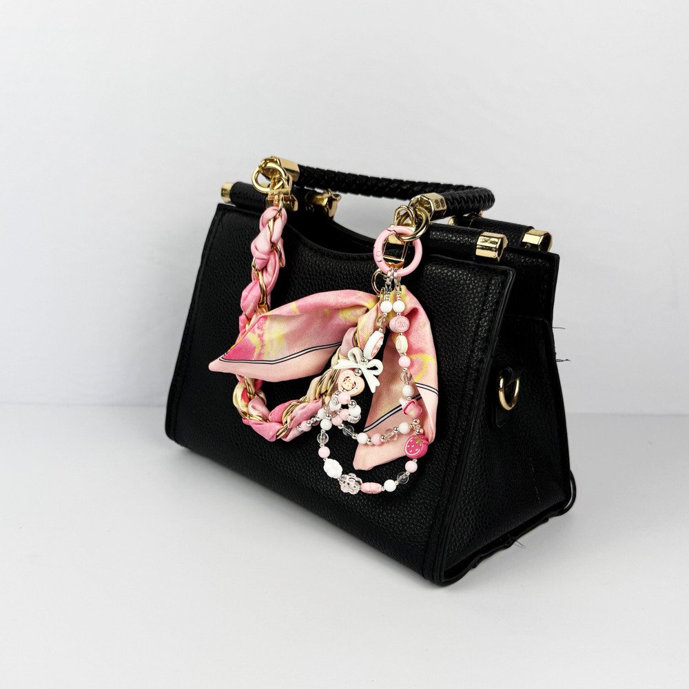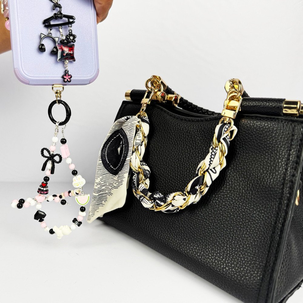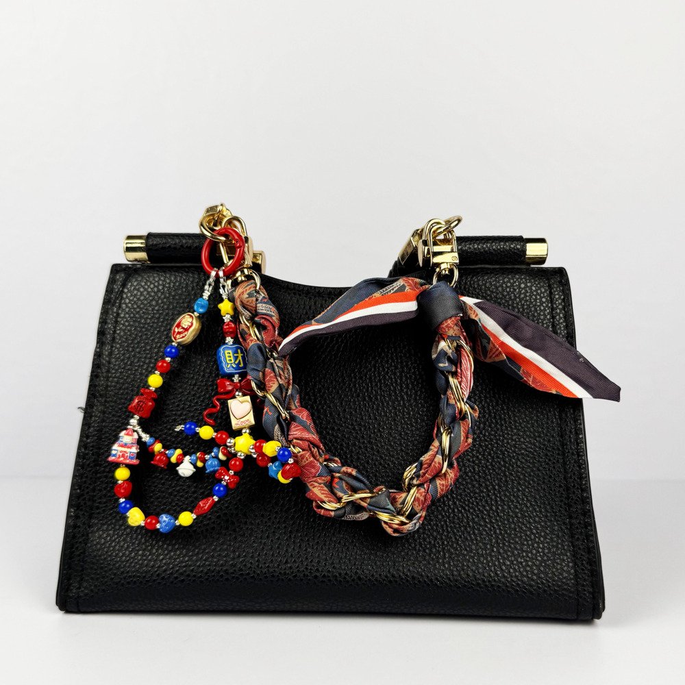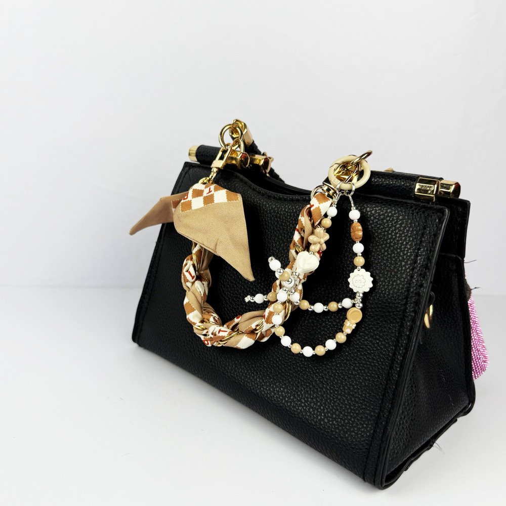 Featuring a fabric scarf chain, a pastel beaded strap, and a gold metal clip, this versatile accessory instantly transforms ordinary bags into stylish statement pieces.