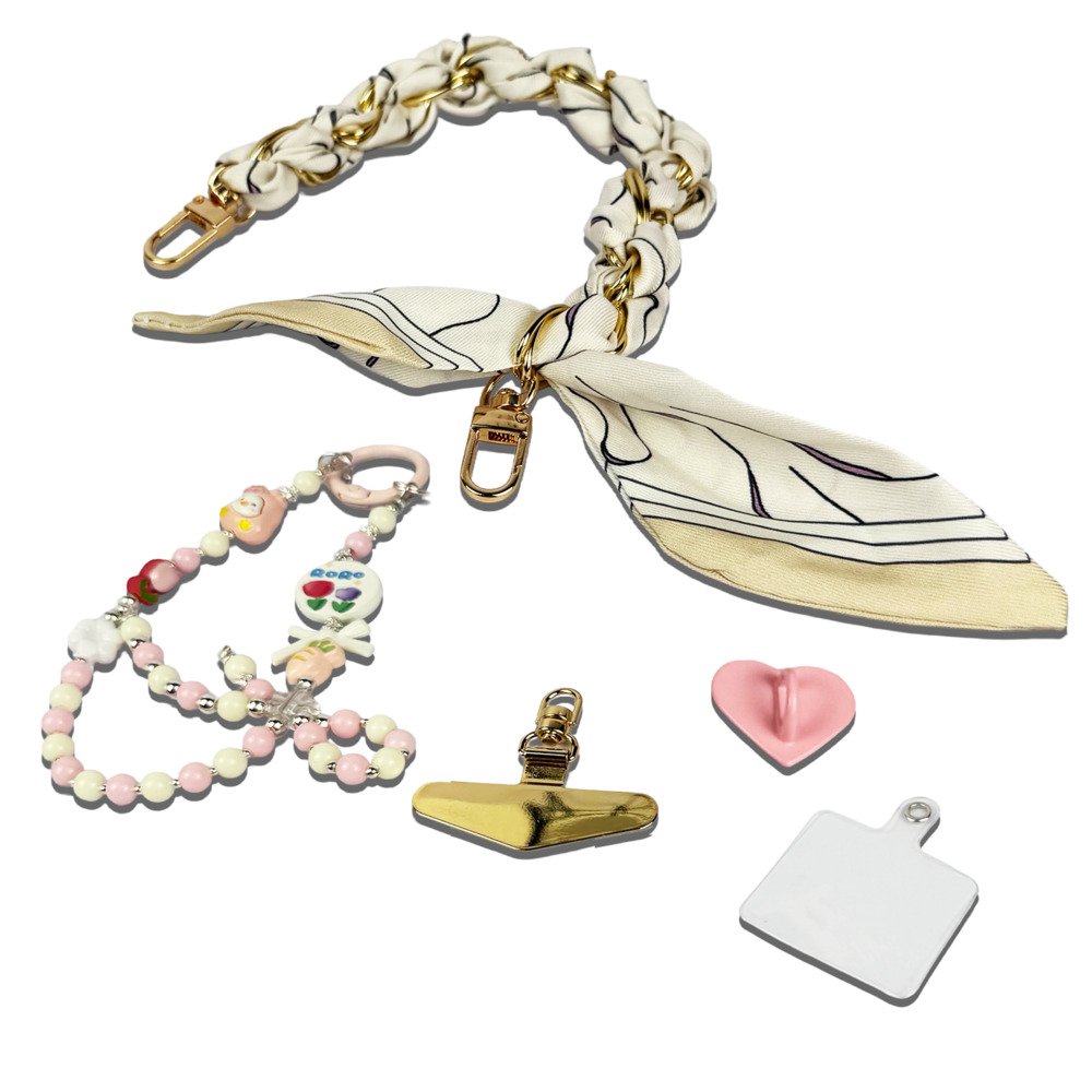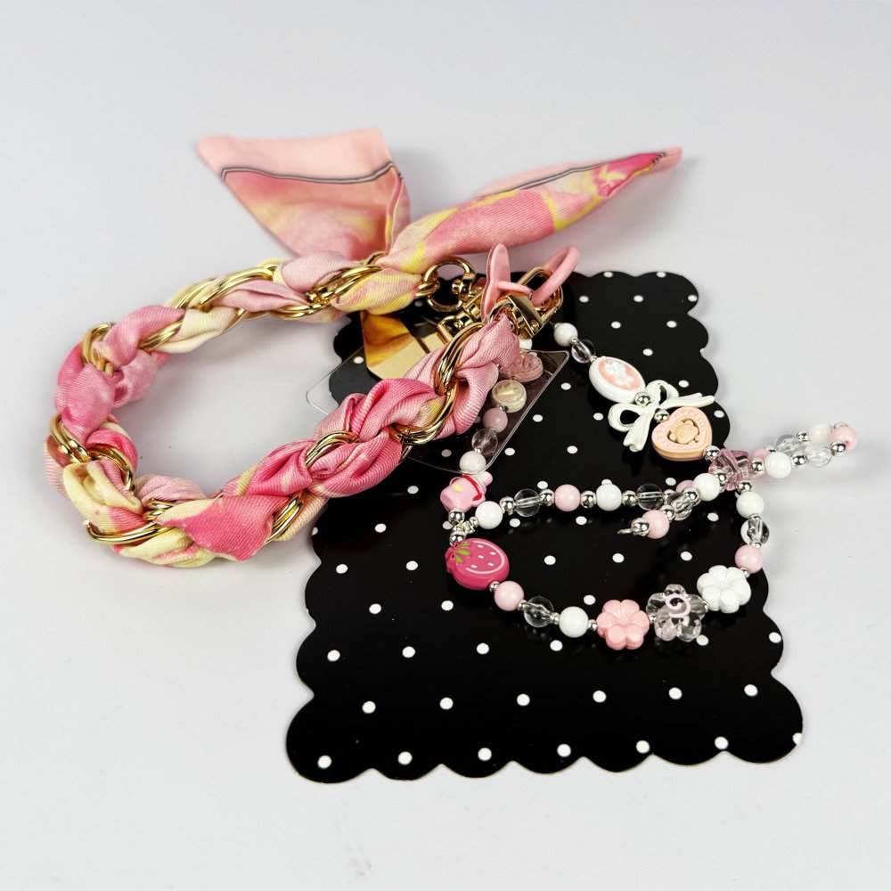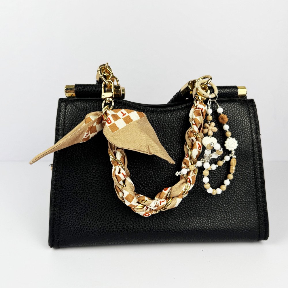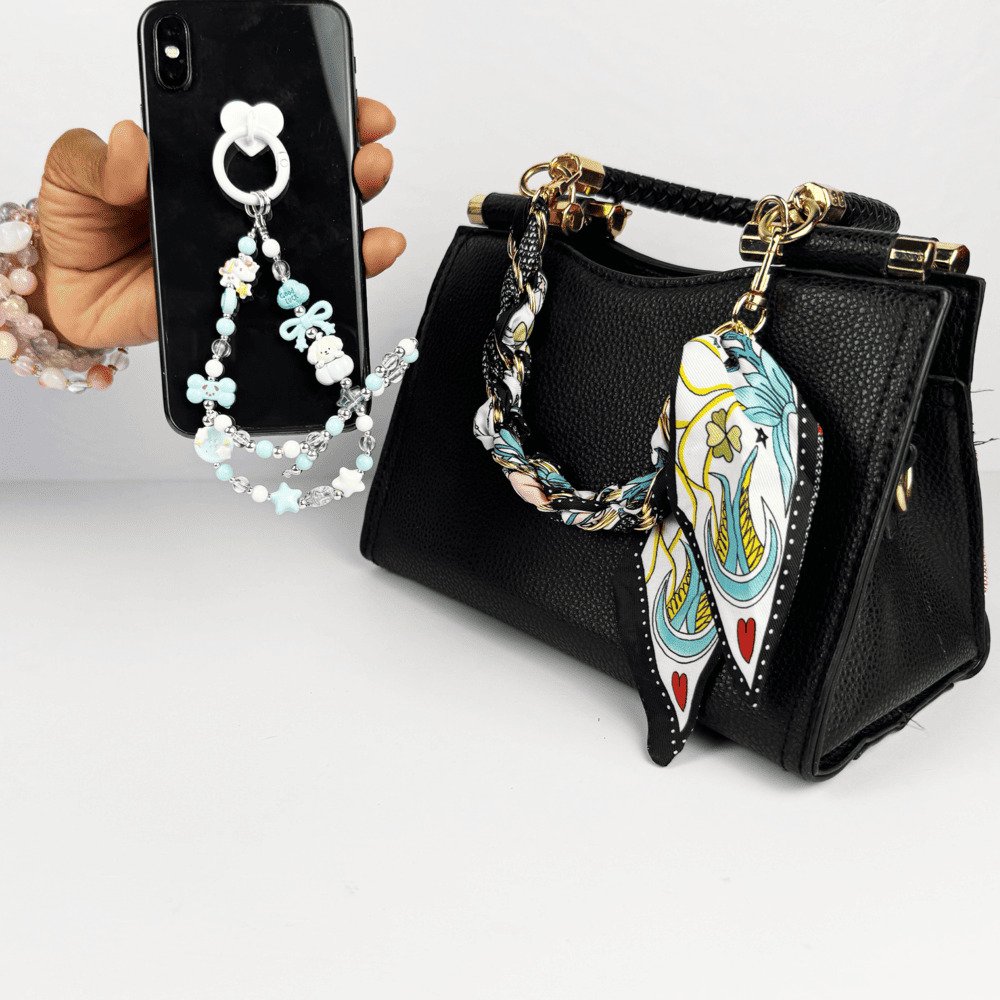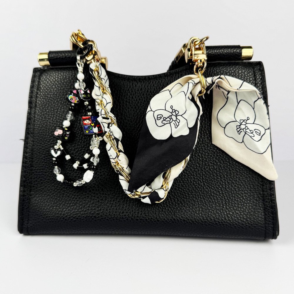 Featuring a fabric scarf chain, a pastel beaded strap, and a gold metal clip, this versatile accessory instantly transforms ordinary bags into stylish statement pieces.