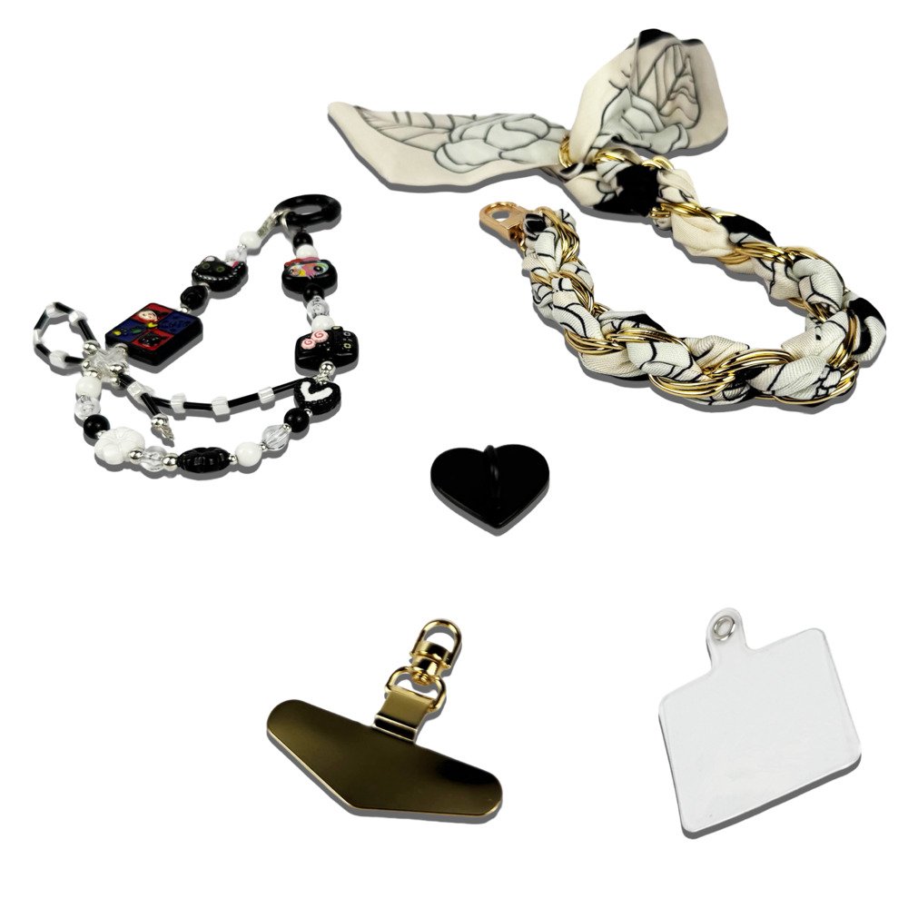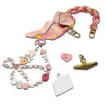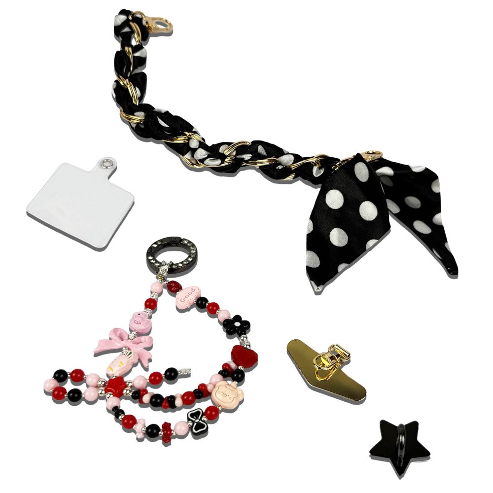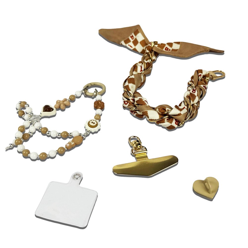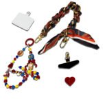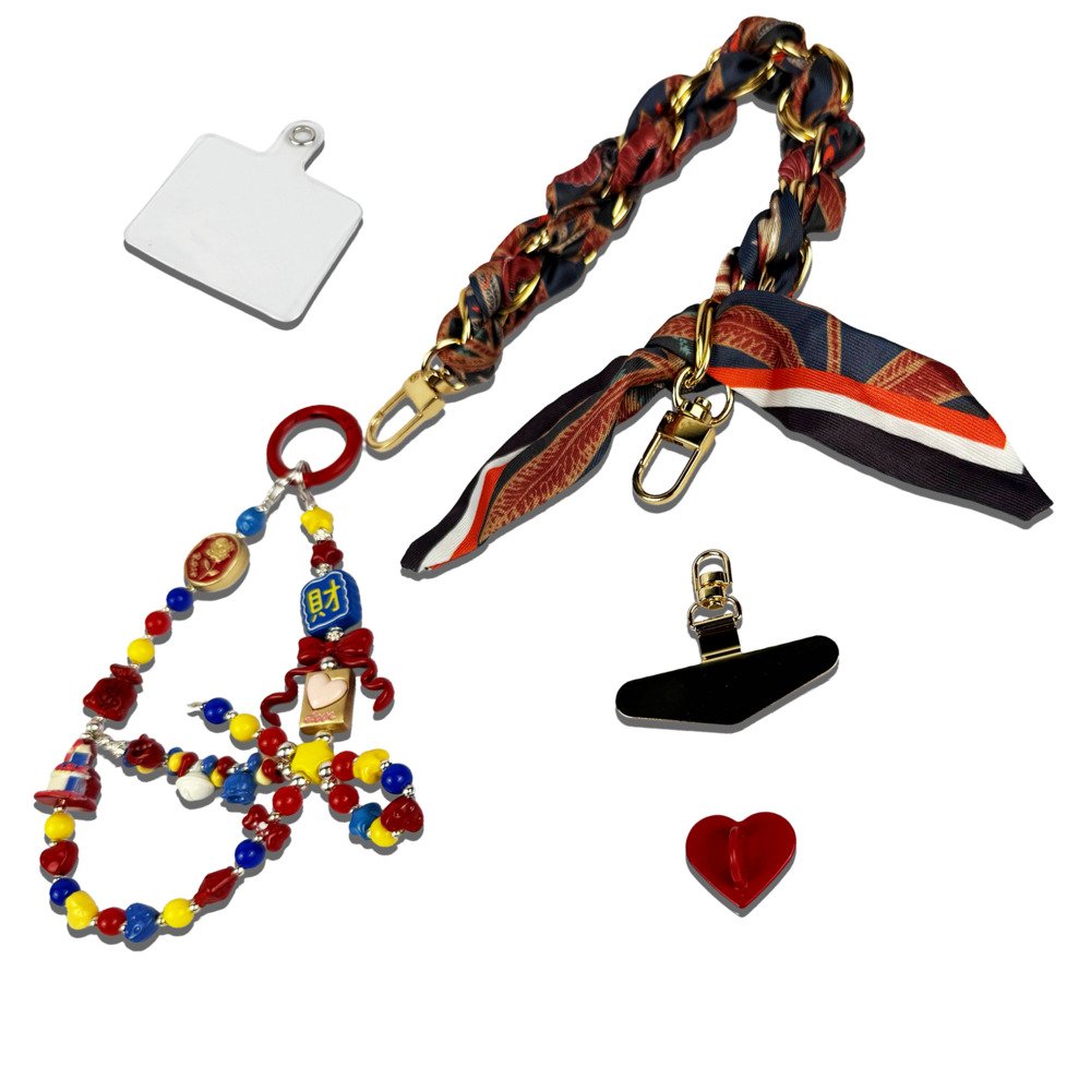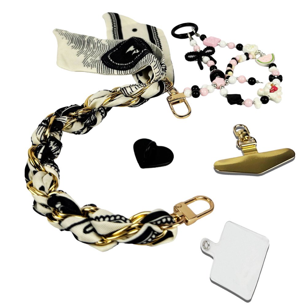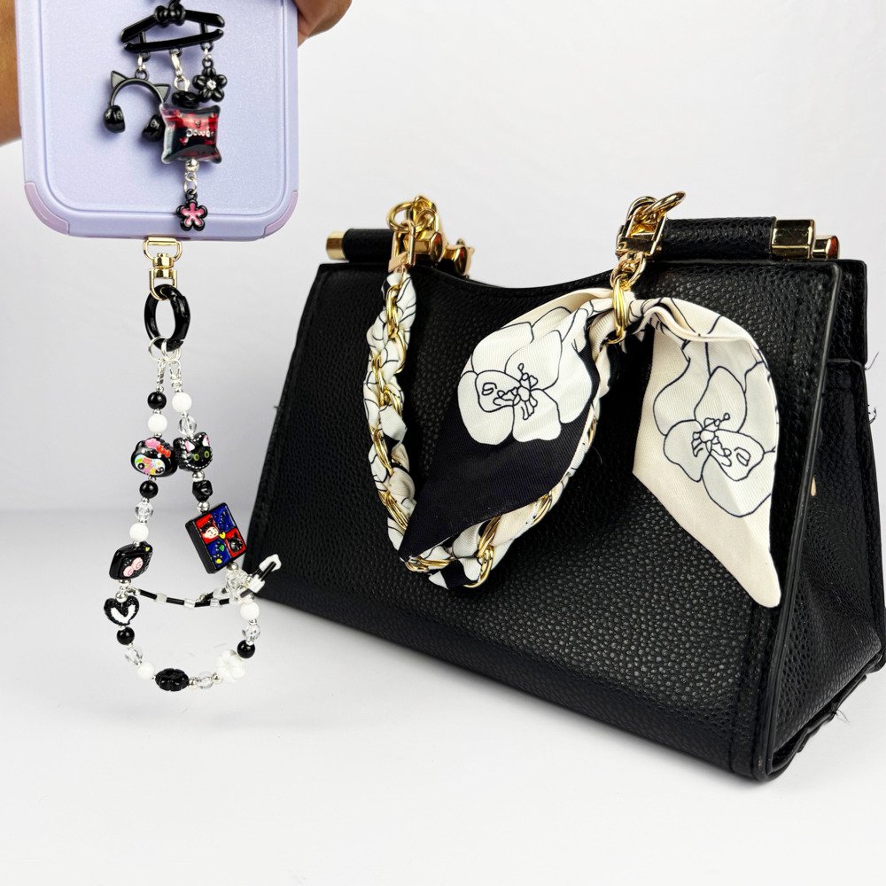 Featuring a fabric scarf chain, a pastel beaded strap, and a gold metal clip, this versatile accessory instantly transforms ordinary bags into stylish statement pieces.