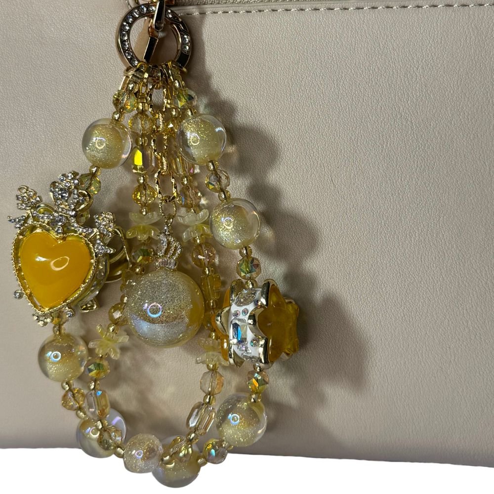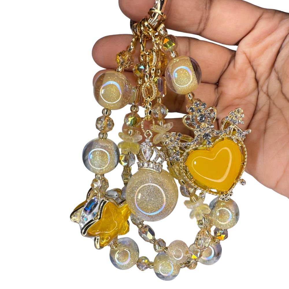 Brighten your everyday routine with the Handmade Yellow Beaded Phone Charm Lanyard, a cheerful accessory that blends style, function, and positivity. Crafted with gold-tone glass beads, iridescent resin globes, and heart-and-star charms, this piece captures the light beautifully — adding a joyful shimmer to your phone, bag, or wrist.