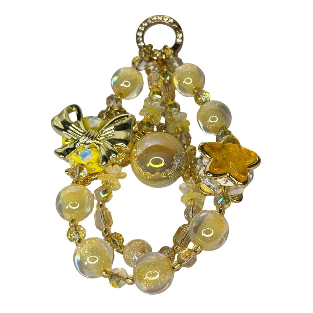 Handmade Beaded Jewelry Chain | Yellow Beaded Phone Charm – Handmade Iridescent Heart, Star & Bow Lanyard