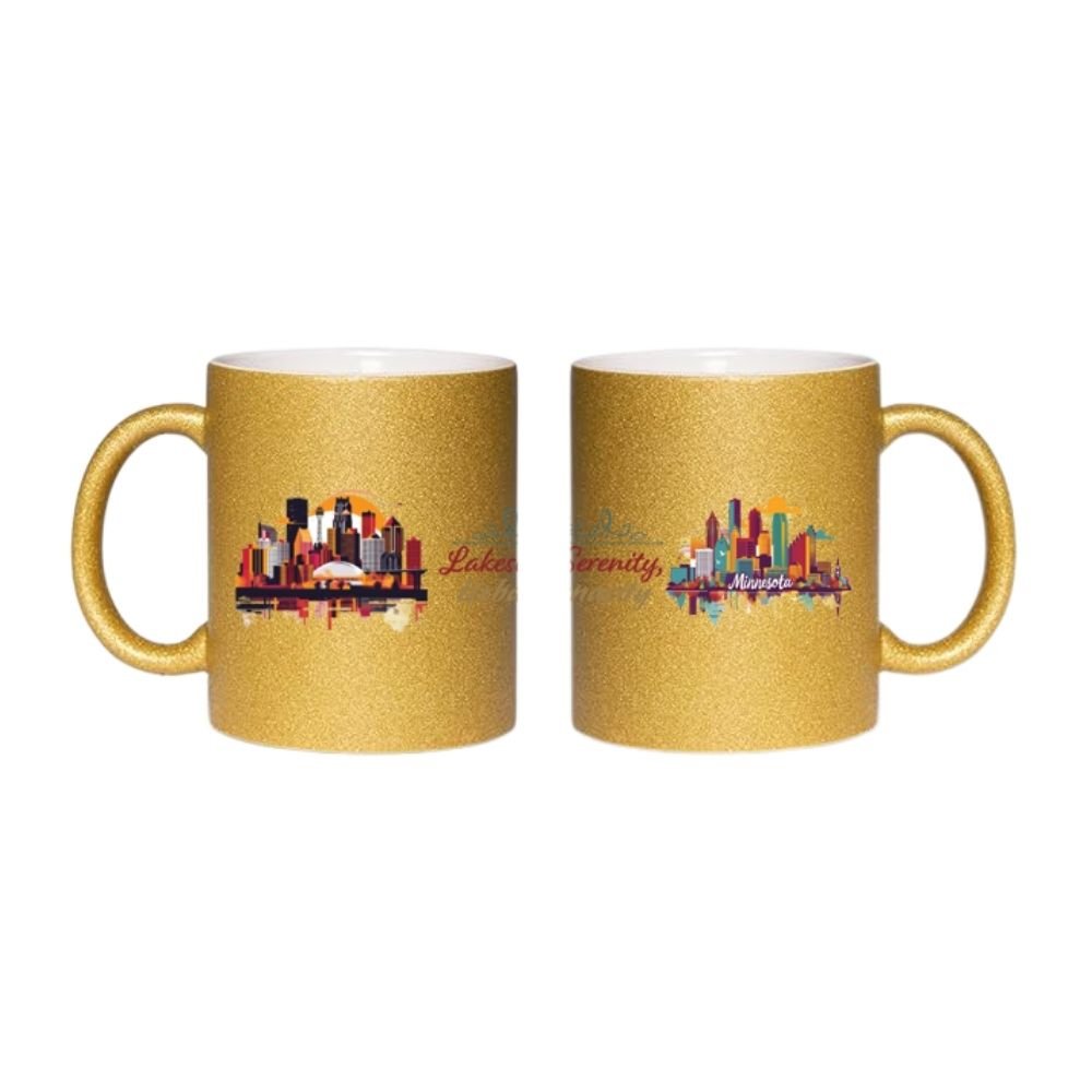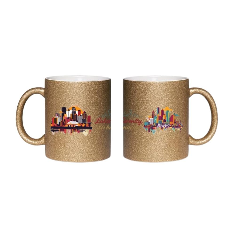 Each glitter finish enhances the Minnesota skyline and lakeside artwork while giving the mug its own personality.