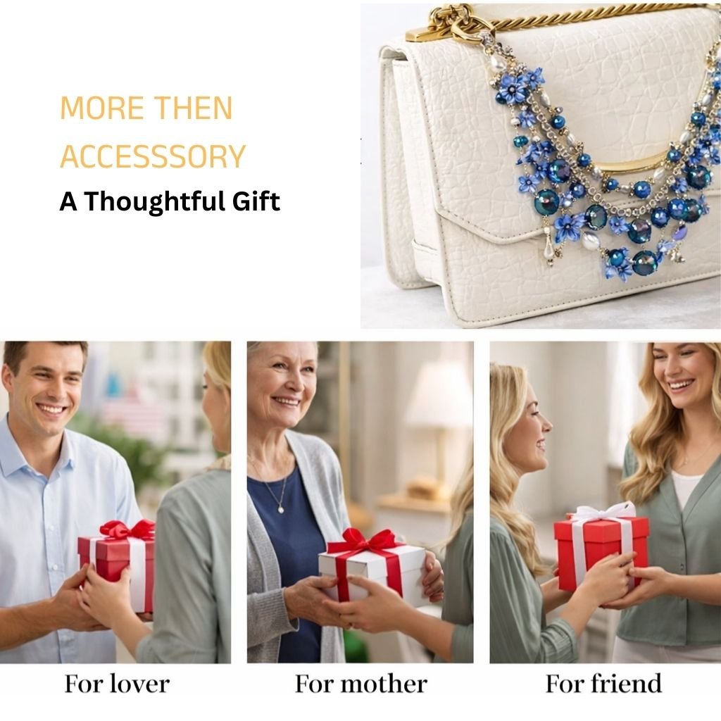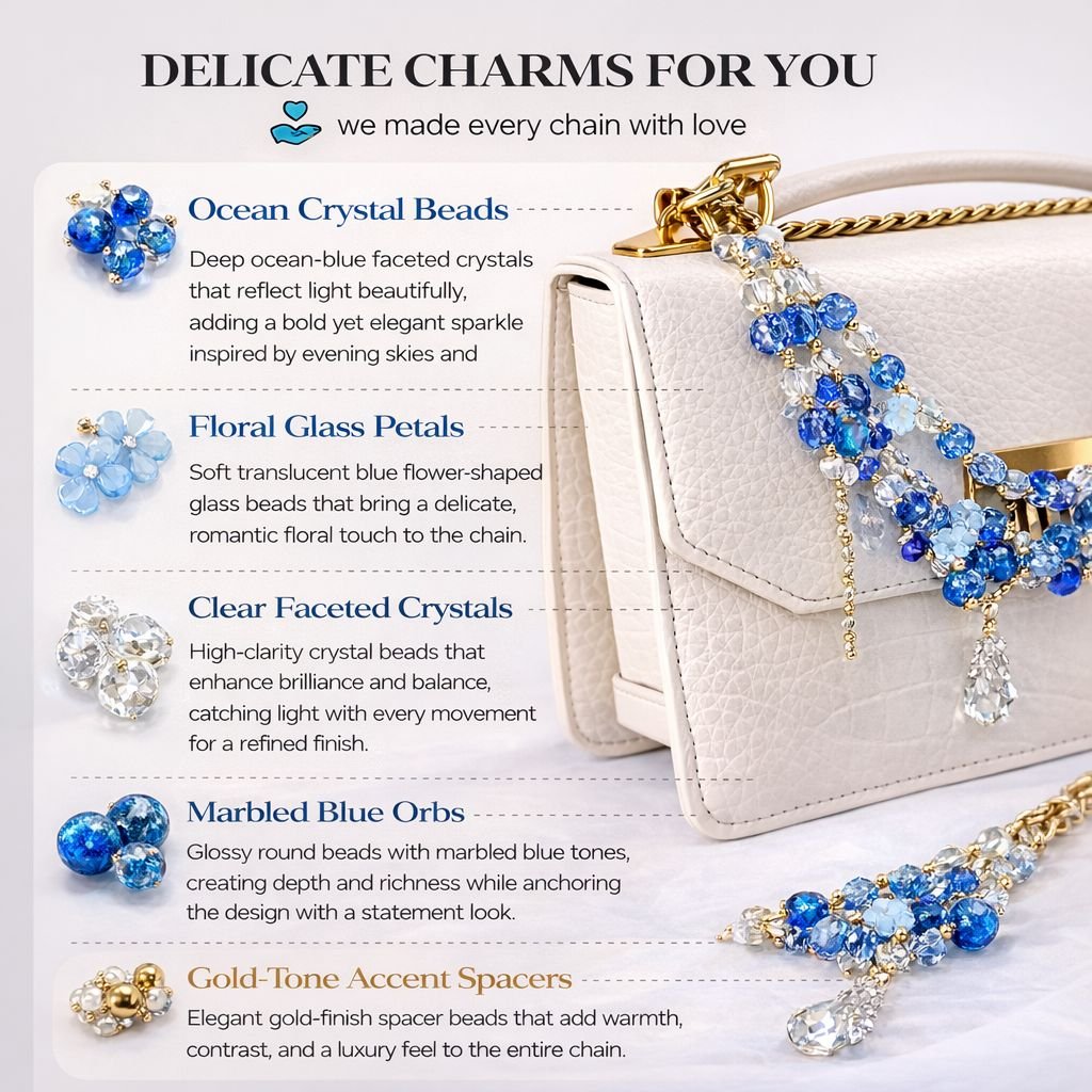 Handcrafted with shimmering blue glass beads, floral accents, and reflective crystal elements, this decorative bag chain brings a rich, polished, and high-end look to your favorite handbag. Whether you’re heading to work, a brunch date, a party, or a special occasion, this accessory adds sophistication without overpowering your outfit.