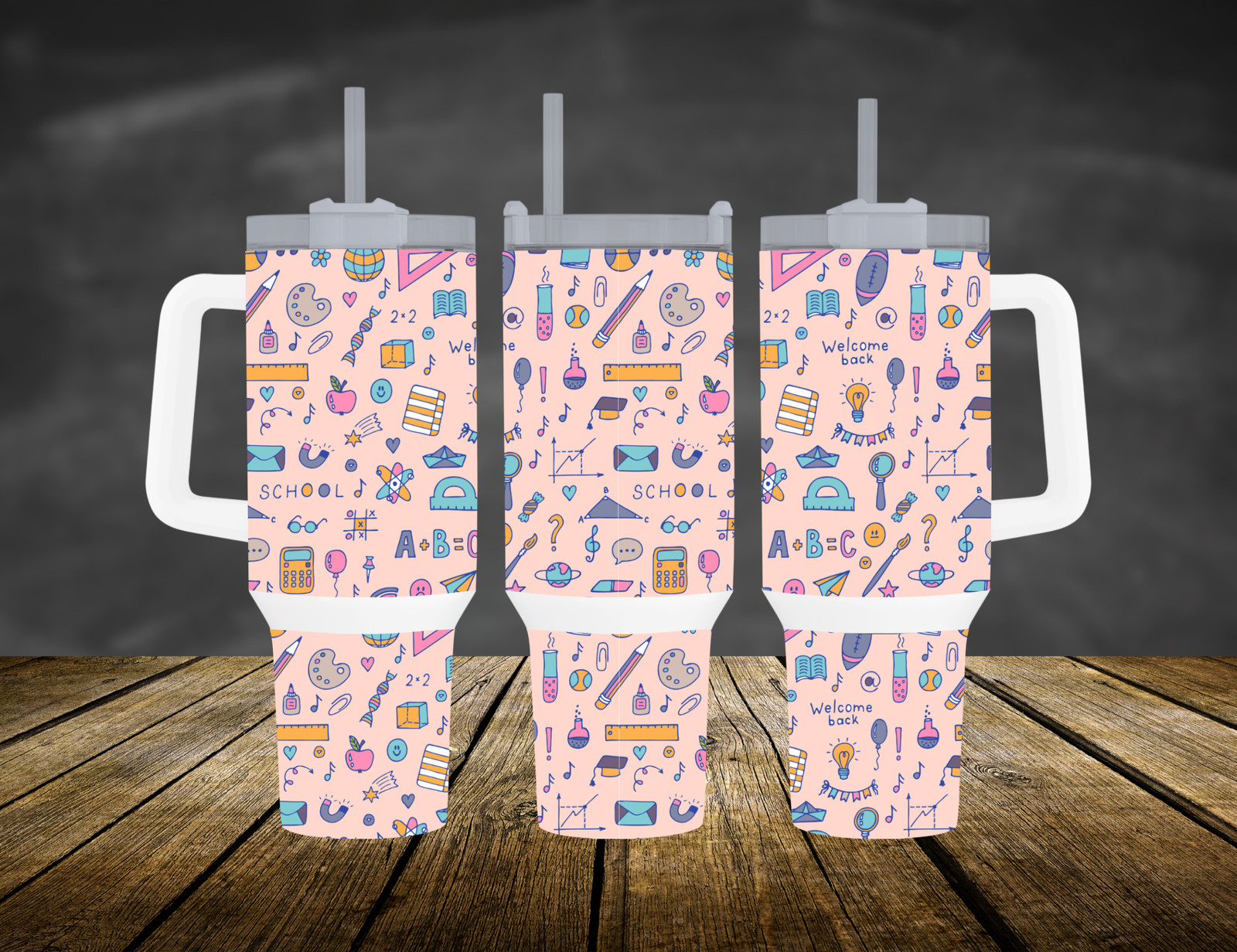 Combining practicality with style, our cute classroom icons patterned 40oz travel mug with handle and straw is not just a necessity but a delightful accessory for every student.